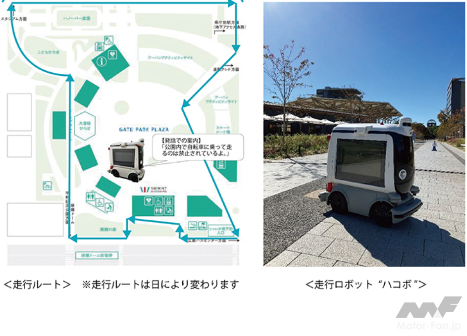 平日の日中帯、「ひろしまゲートパーク」および周辺道路で「ハコボ」を自動走行させ、巡回パトロールを行う。ロボット走行時には、公園内のルールに関する注意喚起をロボットから発話させ、公園利用ルールの認知度向上や禁止行為の抑止による公園の適切な利用推進への効果が検証される。また、通常、人が行っているパトロールをロボットで実施した場合の課題の洗い出しを行い、将来的なロボットの本格導入に向けた可能性が検討される。