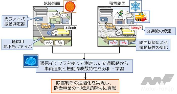 この地域課題に対応するため3社は、NTT東日本が通信用に敷設した未使用の地下光ファイバとNECが提供する光ファイバセンシング技術を用いて得られた青森市内における市道の交通振動データに対して、NTTが提案した除雪要否と交通振動特性の相関分析手法にNECの車速検出アルゴリズムを組み合わせることで、除雪実施判断を行う実証実験を行った。