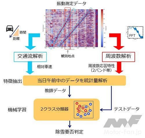 - 交通振動から車速情報と振動周波数の応答特性の統計データを取得し、除雪要否判断モデルを構築、精度を評価(実証実験を通じて、除雪による路面状況の変化により車速や振動周波数の特性が変化する旨を新たに発見し、モデル化)
