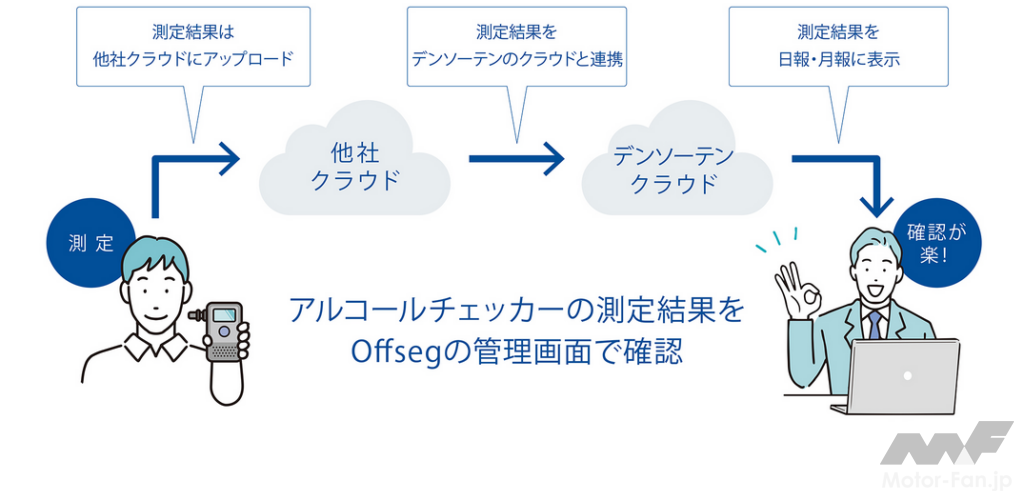 ドライバーがアルコールチェックを行なうと、測定結果がアルコール検知システムを提供する各社のクラウドへアップロードされる。その後デンソーテンのクラウドと連携し、Offsegの日報・月報に測定結果を表示する。安全運転管理者は、Offsegの管理画面上で乗務員ごとの運行記録とアルコール検知結果を同時に確認できるため、手間を省くことができる。