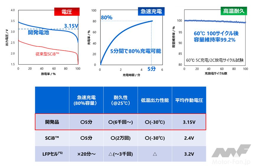今回の開発技術の実証にあたり、東芝はニオブチタン酸化物(NTO: Niobium Titanium Oxide)負極を採用し、1.5Ah級のラミネート型電池を試作した。電池性能評価では、3V以上の高電圧、5分間で80%の急速充電性能、充放電を6000回以上繰り返しても初期に対して80%以上の容量を維持する耐久性、および60℃の高温下においても優れた寿命特性が実証された(図3)。