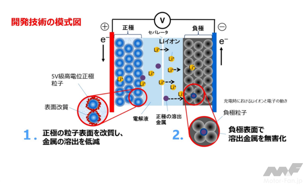 当社は、高電位正極の表面で電解液が分解されてガスが発生することや、正極材料に含まれる金属が溶出し、溶出した金属が負極表面でガス発生を促進するメカニズムを持つことがつきとめれらた。これにより、正極の粒子表面を改質して電解液との反応を抑制する技術に加え、負極表面で溶出イオンを無害化する技術が開発された(図2)。この技術により一般的に広く使用されている電解液を使ってもガスの抑制が可能となる。