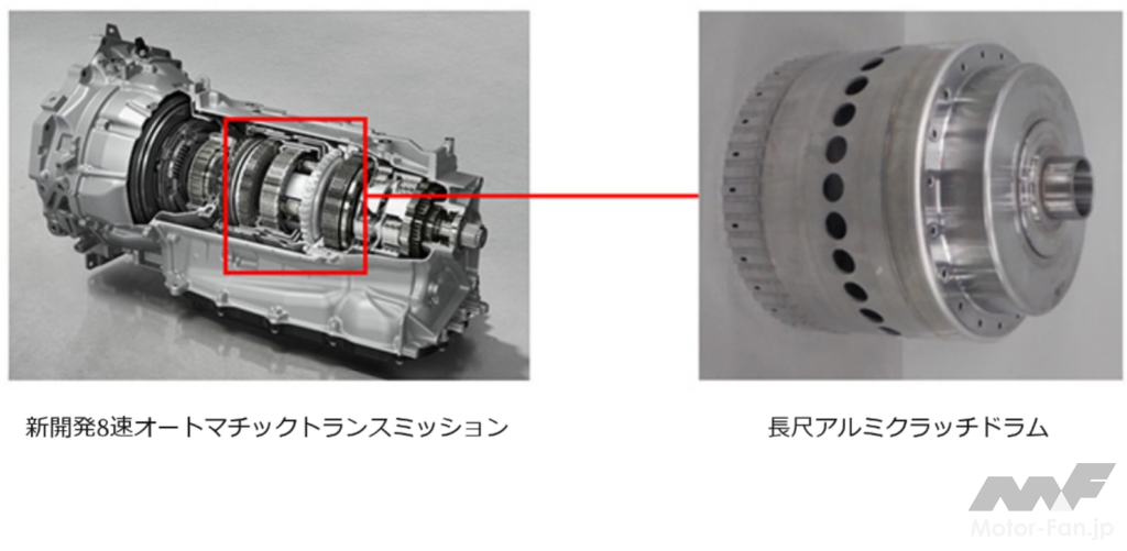 8速ATに採用された技術のうち、今回の受賞対象となったのが「長尺アルミクラッチドラムの塑性(そせい)加工化技術」。動力の伝達や遮断を担うクラッチドラムを、従来の鉄やアルミ鋳造品より軽量なアルミ塑性加工品とするとともに、これを既存の塑性加工(生産)ラインを活用して製造する技術を開発。コスト上昇を抑えながらユニットを軽量化することにより、CO2排出量の低減とともに、自然なドライビングポジションの実現に寄与していることが評価された。