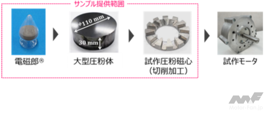 また、JFEスチールとJFEテクノリサーチ株式会社は、顧客での圧粉磁心を用いた部品の設計支援を目的とした、外径110mmの切削加工用大型圧粉体の提供や、設計形状に加工した試作圧粉磁心の提供を開始した。