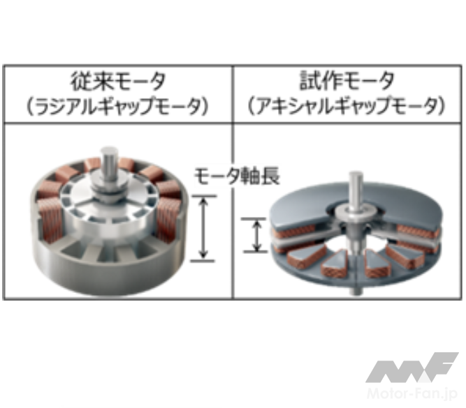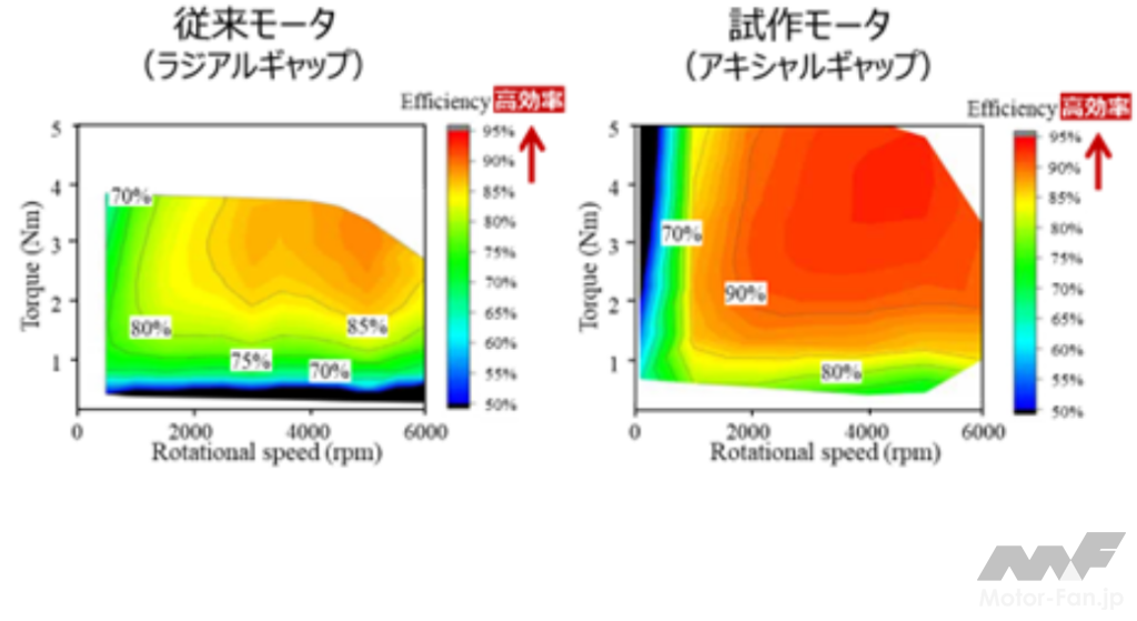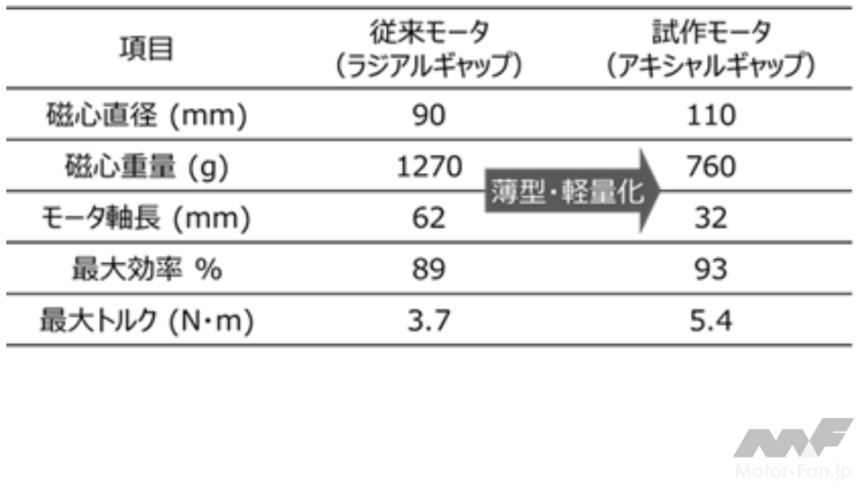 今回3社は、『電磁郎』より製造した圧粉磁心を用いて、アキシャルギャップモータを設計・試作し、その性能を評価した(図2)。その結果、従来モータに対し、高さで48%薄型化、重量で40%軽量化したうえで、同等以上の高い効率を実現可能であることが実証された(表1、図3)。