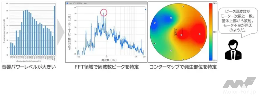 本システムは、1つのソフトウェアで音響パワーレベル計測と原因分析を行うことができる。規格のオクターブ毎の結果よりも詳細な音響パワーレベルを観測することで、音の原因となる周波数ピークやタイミング、音源位置の特定を効率よく実施が可能。再計測の手間なく原因分析を行うことができ、騒音試験のコスト削減につながる。