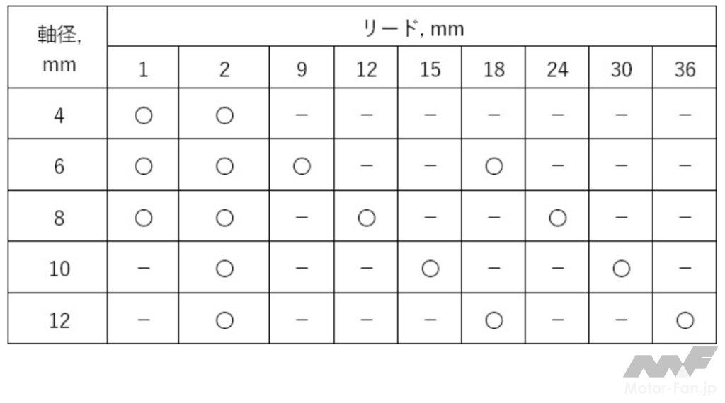 ※2 軸径12mm、リード(ナットが1回転した場合に直進方向へ移動する距離)2mm仕様の場合。商品仕様や使用条件により異なる。