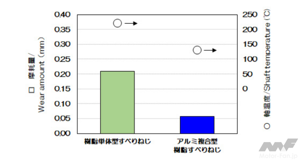 アルミ合金製の基材とNTN独自のPPS樹脂複合材料の一体成形により、許容アキシアル荷重を樹脂単体型と比べて80%向上※2させている。アルミ合金製の基材の使用により、しゅう動部の温度上昇を抑制し、樹脂単体型すべりねじと比べて摩耗量が70%減少※2、長寿命化も実現した。