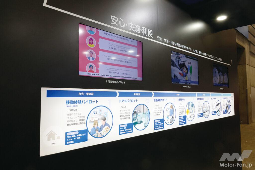 もうひとつのテーマは将来に向けた技術開発の方向性を示した「安心・快適・利便」というキーワード。クルマに乗る前から降りた後に至る一連の“移動体験”において、ユーザーに安全と快適を提供するために様々な技術を統合的に活用していくことを考えているという。