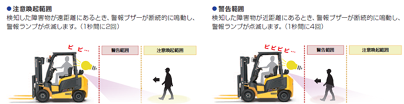 後進時にステアリング角度(タイヤ切れ角)から進行方向を予測し、その方向に衝突の危険性がある場合にオペレーターに警報を発する。車両の進行方向外にある人、荷物等に対しては警報を発しないため、オペレーターへの不要な警報を低減している。