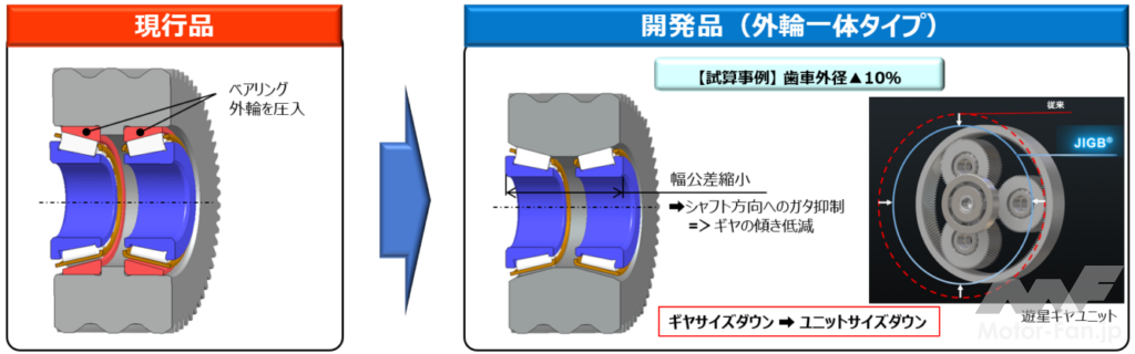 ギヤの内部にベアリングを組付ける場合、組付け時のガタにより、ギヤ全体の強度が低下する可能性がある。これに対し開発品では、ギヤ内径をベアリングの外輪とすることにより、ギヤの傾きを低減し、ギヤサイズ及び、搭載されるユニットのサイズダウンを実現。またギヤ内径へのベアリング圧入工程の省略による部品点数の削減も見込まれる。