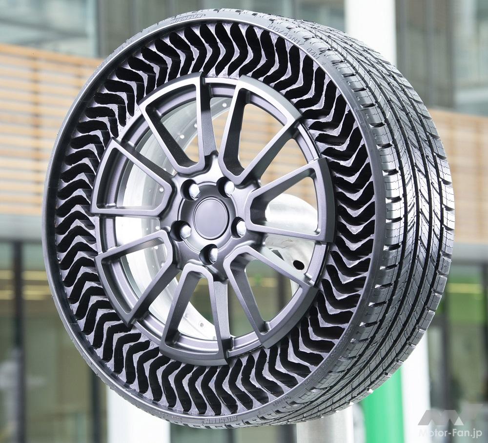 『アプティス』は、アルミホイールと、ミシュランのハイテク素材に関する専門知識の産物であるガラス繊維強化プラスチック(GFRP)で作られた柔軟な耐荷重構造を組み合わせることで、高レベルの性能品質を保証し、乗用車のニーズに完全に適合する。エアレスだから車両が突然使えなくなるリスクを軽減し、タイヤ関連のメンテナンスを軽減する。環境に対しては、エアレス技術がパンクにより廃棄されるタイヤの数を大幅に削減することで、フットプリントを小さくする。そしてミシュランとGMとのパートナーシップにより、2024年に市場に投入される。共同研究契約の一環として『ボルトEV』等でテストされており、現在は実際の運転条件下での動作に関するテストが続けられている。