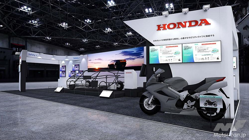 「Honda CI(Cooperative Intelligence※以下、CI)」を用いて、360度リスク認知によるCI運転支援により、CIが周辺状況から運転リスクを予測して、そのリスクをドライバーに伝達することで安全行動を促し、ドライバーのリスク見落としによる交通事故を低減することを目指す技術が紹介される。具体的には、後付けも可能な前後カメラでリスク認知状態を検出するとともに、交通シーンとドライバーの認知状態に応じて、車内に設置したLEDリスクインジケーターでドライバーに対して注意喚起を光と音でお知らせする技術が紹介される。