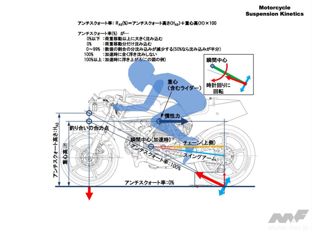 インターネットにあるMCの側面の画像やご自身のMCを側面から観察し、目分量でアンチスクォート率を推測してみるのも面白いです。大抵は100%前後にあるのがわかります。これは荷重移動を速やかに終了させ後輪のトラクションを稼ぐための設定です。