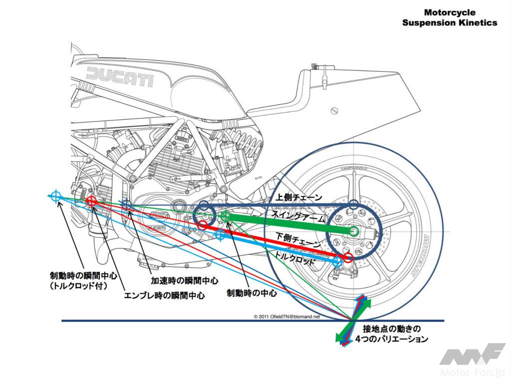 このスイングアームと上側チェーンの動きは合成され結果的にタイヤとホイールはそれぞれの延長線が交わる点のまわりに回転しようとします。