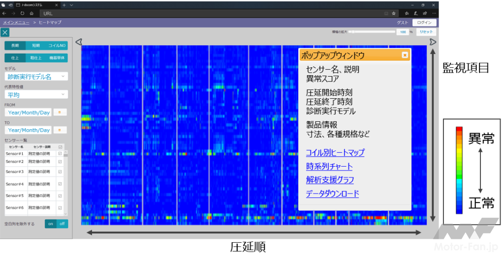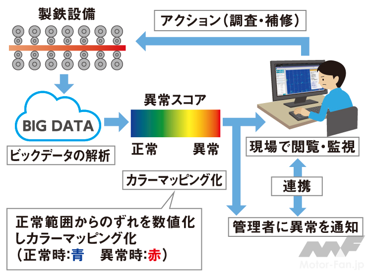 本システムを2018年度に最初に導入した西日本製鉄所(倉敷地区)熱延工場においては、年間50時間以上(生産量3万t以上)相当のトラブル抑止効果が確認されている。これまでに、西日本製鉄所(倉敷・福山地区)および東日本製鉄所(千葉・京浜地区)の全地区熱延工場に本システムを導入した。全地区共通のシステムを導入し、異常診断モデル等を全地区で容易に共有できるようにすることで、全社レベルで最適なモデルの構築を推進している。今後は、製銑や製鋼をはじめとする他製造プロセスにも展開していく。