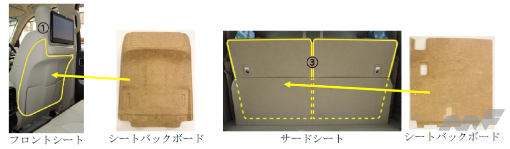 また、フロントシート(①)とサードシート(③)のシートバックボードには、植物材料のケナフ繊維と石油由来のポリプロピレン(PP)を混合した基材を採用。従来のPP基材に比べ約20%の軽量化を実現した。ケナフの活用と部品の軽量化により、自動車のCO2排出量を削減し、カーボンニュートラルに貢献している。