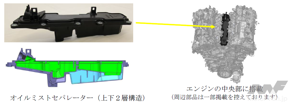 - オイルミストセパレーターは、ブローバイガス※2中のオイルミストを除去する製品で、上下2層のオイル捕集区間の設置により省スペースでありながらオイルミストの高捕集性能を実現した。