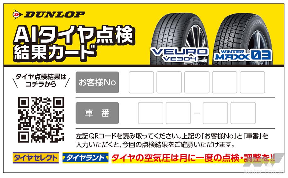 店舗スタッフがスマートフォンでタイヤを撮影し、AIがタイヤの溝の深さに加え偏摩耗を診断し、3段階で摩耗状態の判定結果を表示する。顧客は、撮影した画像を見ながら点検結果が確認できるとともに、点検後に渡す「AIタイヤ点検結果カード」のQRコードを読み込むとオンライン※2でも点検結果を確認することができる。