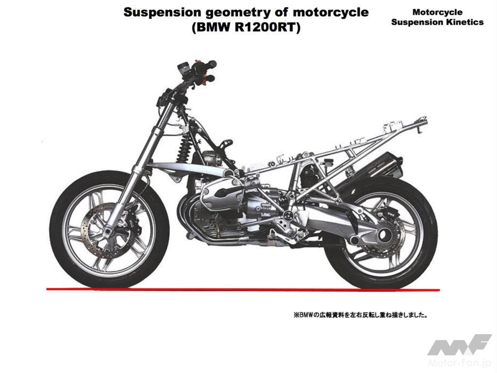 前後とも、いわゆる4リンクサスペンションです。制動時と駆動時にサスペンションに加わる力は、4リンクの瞬間中心を求め、その点をスイングアームの回転中心とみなして作図できます。リヤサスペンションは前に述べたR1200RTと同じ構成なので、フロントのデュオレバーを中心に解説します。