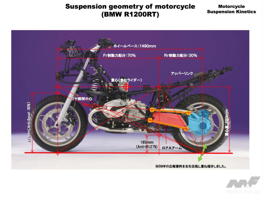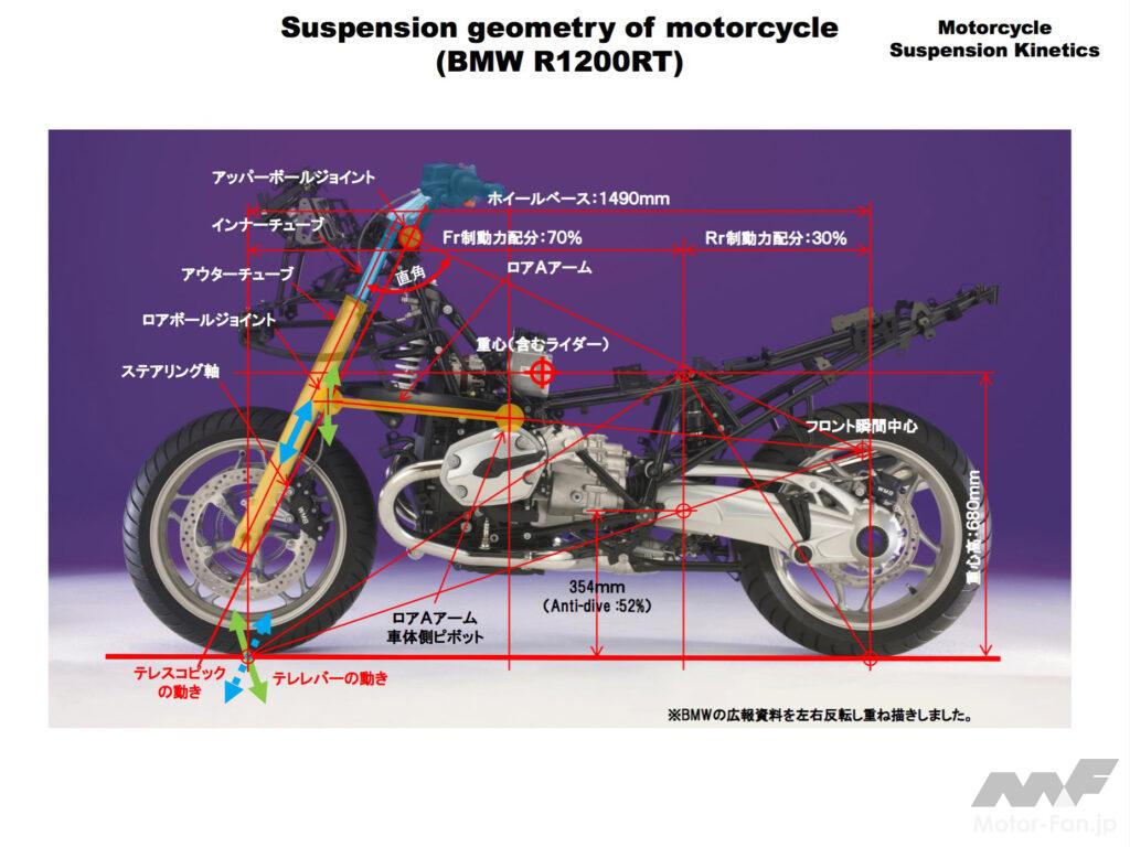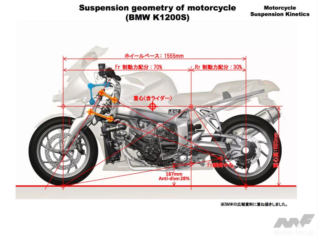 アッパーアームとロアアームの軸線の交点は後輪すぐ手前の低い位置にあり、制動力配分を70:30で作図するとアンチダイブ率は28%になります。これはテレレバーのR1200RTと比べると約半分です。もちろん通常のテレスコピック式のマイナス70%と比べると抑えの効いた姿勢変化特性にはなりますが、もしかするとこの小さめのアンチダイブ率がデュオレバーサスペンションの狙いかも知れません。