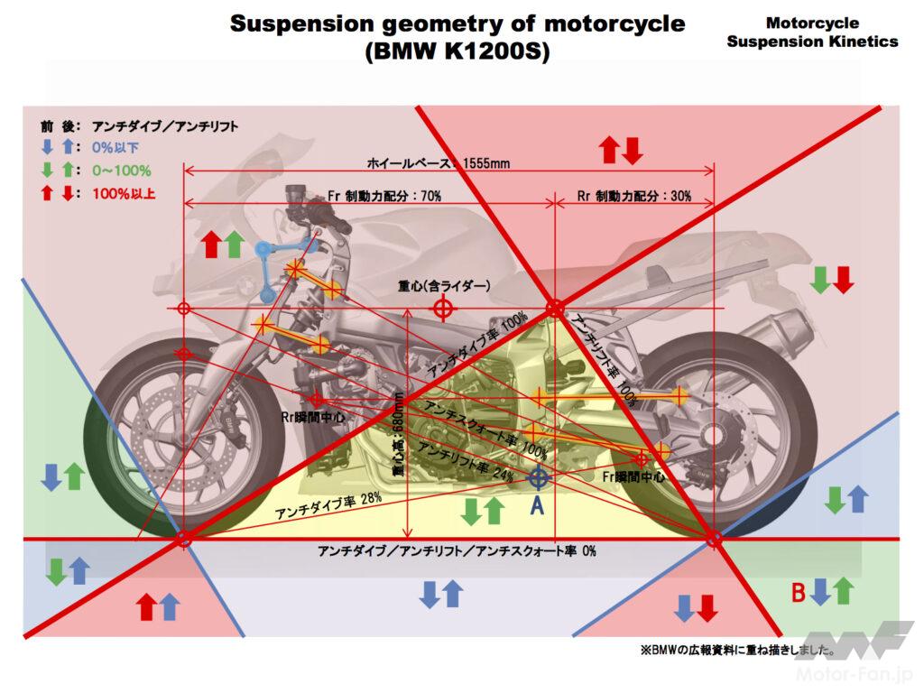 中央の黄色網掛け部A点がBMW K1200Sです。クルマでは一般的な領域ですが、多くのMCがフロントテレスコピックで右下にあるの領域にあるのでK1200SはMCとしては少数派です。先に述べたR1200RTに比べてフロントのアンチダイブ率が低く設定されていて、中央の三角形の底辺に近いところに交点があります。交点が底辺(路面)に近ければアンチダイブ率/アンチリフト率とも小さくなるのでより制動時の姿勢変化を許容します。