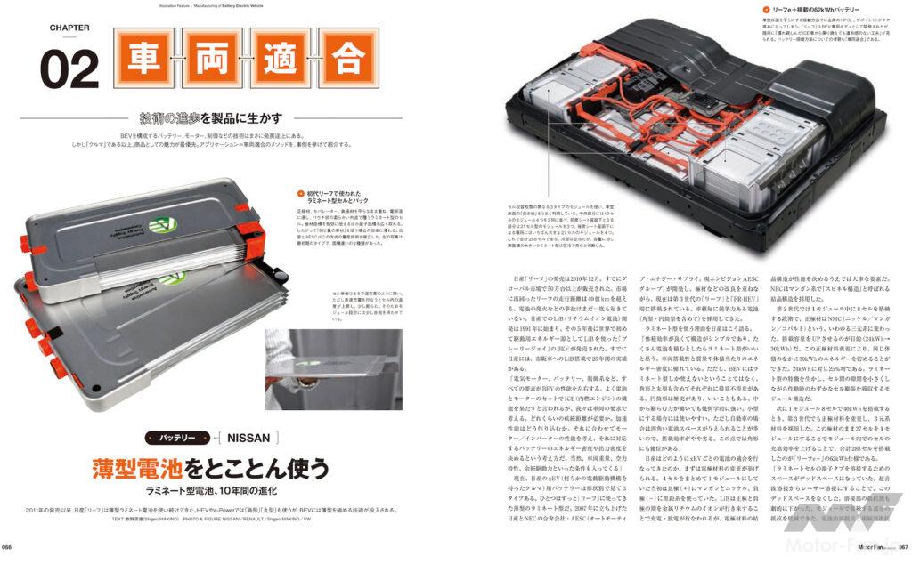 BEV(電気自動車)を構成するバッテリー、 モーター、 制御などの技術はまだ発展途上にあります。 しかし、 クルマである以上、 商品としての魅力が最優先です。 日産のラミネート型電池、 東芝の「5分で80%の充電」実現を目指す次世代電池、 レクサスによるNVHと足まわりの対策、 マツダのパッシブセーフティ技術などアプリケーション=車両適合のメソッドを、 事例を挙げて紹介しています。