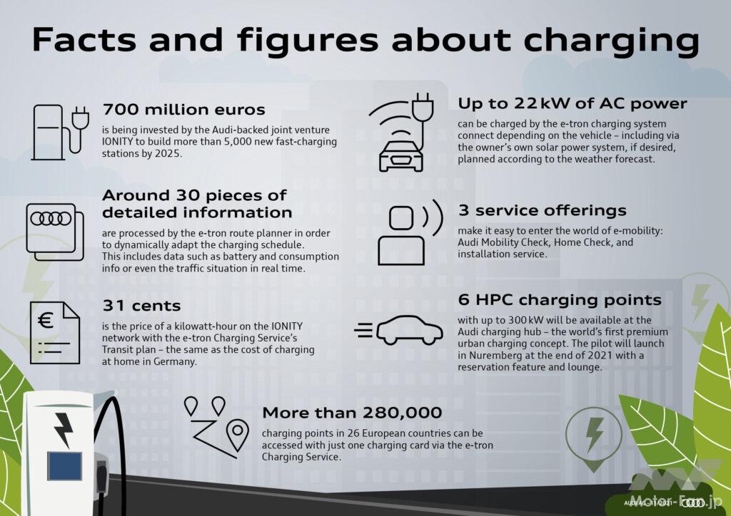 アウディはIONITYの創設メンバーであり、2017年の設立当初からの合弁パートナーである。ヨーロッパ中に張り巡らされたIONITYの急速充電ステーションネットワークは、アウディ独自の充電サービスであるe-tron充電サービスの要である。このe-tron充電サービスは、1枚の充電カードを使用するだけでヨーロッパ26か国で280,000を超える充電ポイントにアクセスできる。そしてe-tron充電サービスユーザーはIONITYネットワークを使用する際に優先条件の恩恵を受けることができる。充電コストは1kWhあたりわずか31セントであり、これはドイツの自宅での充電コストとほぼ同等である。