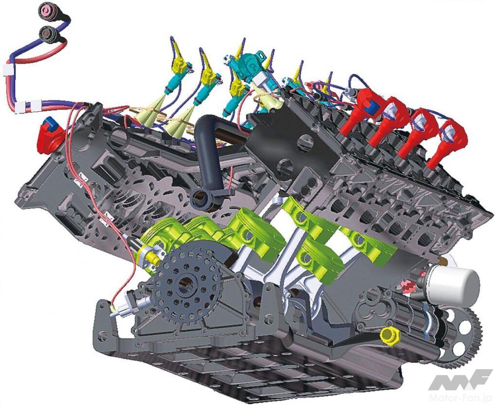 アルミ鋳物シリンダーブロック+アルミ鋳物ヘッドの組み合わせ。マグネシウムの使用はレギュレーションで禁止。GT1車両を企画する時期と市場投入のタイミングが合わず、連続可変リフト量制御(VVEL)+直噴を投入することはできなかった。