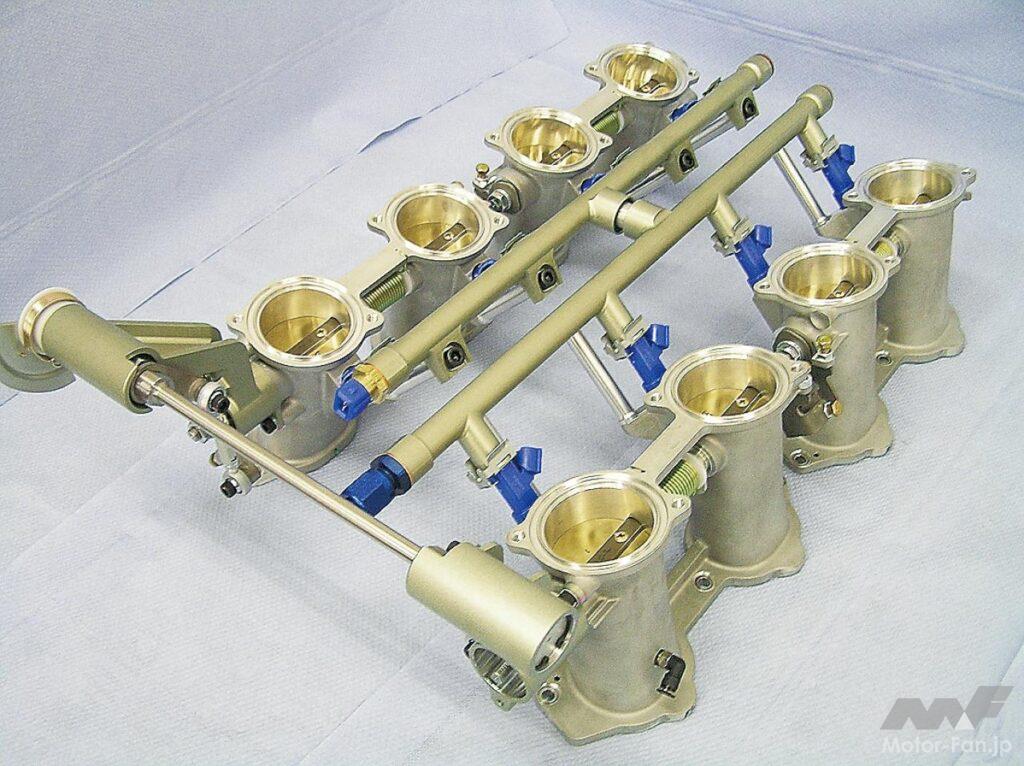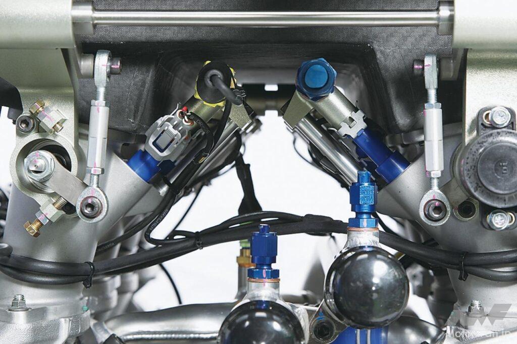 VKシリーズはもともと4.5ℓ(ボア93mm)からスタートしたが、信頼性の確保や水回りに余裕を持たせるため、ボアピッチを広く設計(112mm)してあった。だから、5.6ℓ(ボア98mm)を高出力化してもブロック、ヘッドの補強は不要だったという。リストリクターは32.8mm×2で、29.1mm×2のスーパーGTより大きい。エキマニはインコネル製。右バンクは1番と3番、5番と7番を集合。左バンクは隣り合うポートを集合させている。