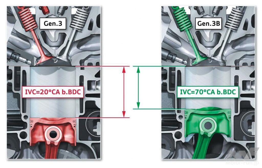 圧縮比<膨張比を実現する方法には、吸気行程でピストンが下降しているとき、下死点に到達する前に吸気バルブを閉じる「早閉じ」と、下死点を過ぎて圧縮行程で閉じる「遅閉じ」の2種類がある。アウディがA4に積んで導入するライトサイジング(=ミラーサイクル)の第1号は、ダウンサイジングのコンセプトで開発した1.8ℓ直4直噴ターボ、EA888 Gen.3の進化版EA888 Gen.3Bで、排気量を200cc増量させ2.0ℓとした。容積比(上死点容積÷下死点容積)は従来の9.6から11.7に高めている。圧縮比<膨張比は吸気バルブの早閉じによって実現しており、アウディ得意のソレノイド作動によるカム2段切り替え機構によって制御する。