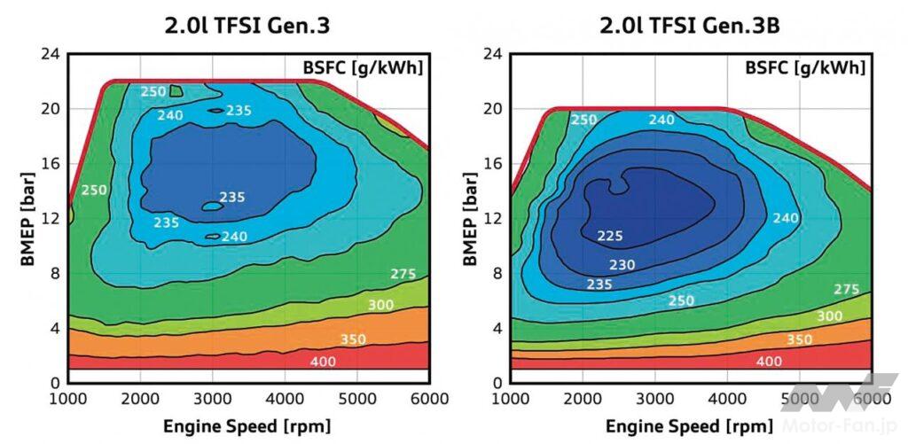 EA888 Gen.3Bは主にミラーサイクルを取り入れたことにより、BMEPがEA888Gen.3の22barから20barに低下しているが、230g/kWhだった最良燃費率は220g/kWhに向上し、ベンチマークに据えた235g/kWh以下のエリアが大幅に拡大。これにともなって広い運転領域で燃費が向上している。