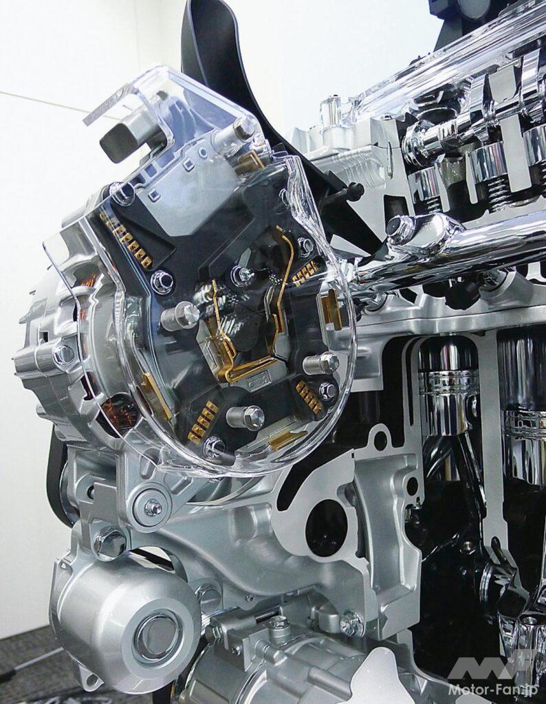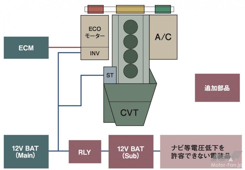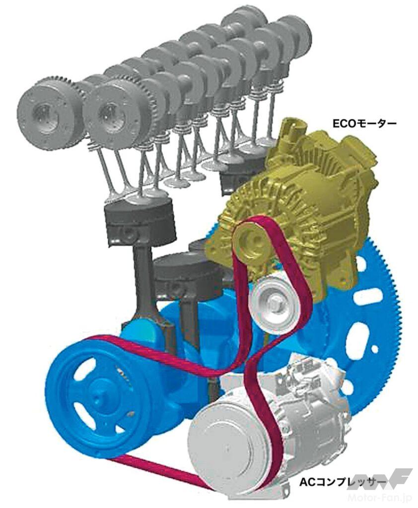 S-HYBRIDのキモになるのは、オルタネーターとモーターの機能を持つECOモーターだ。ECOモーターそのものは、従来型でもアイドルストップのために搭載していた。S-HYBRIDでは、ECOモーターの能力を上げ回生による発電量もモーターとしての出力も高め、駆動力アシストにも使えるようにした。発電量を増やした受け皿として、12V鉛バッテリーをひとつ追加し、従来以上にアイドルストップする機会も時間も増やすことで燃費を改善させている。