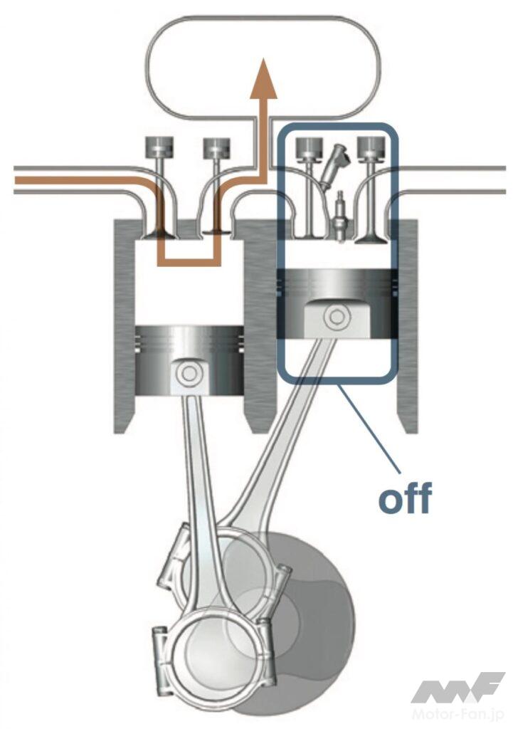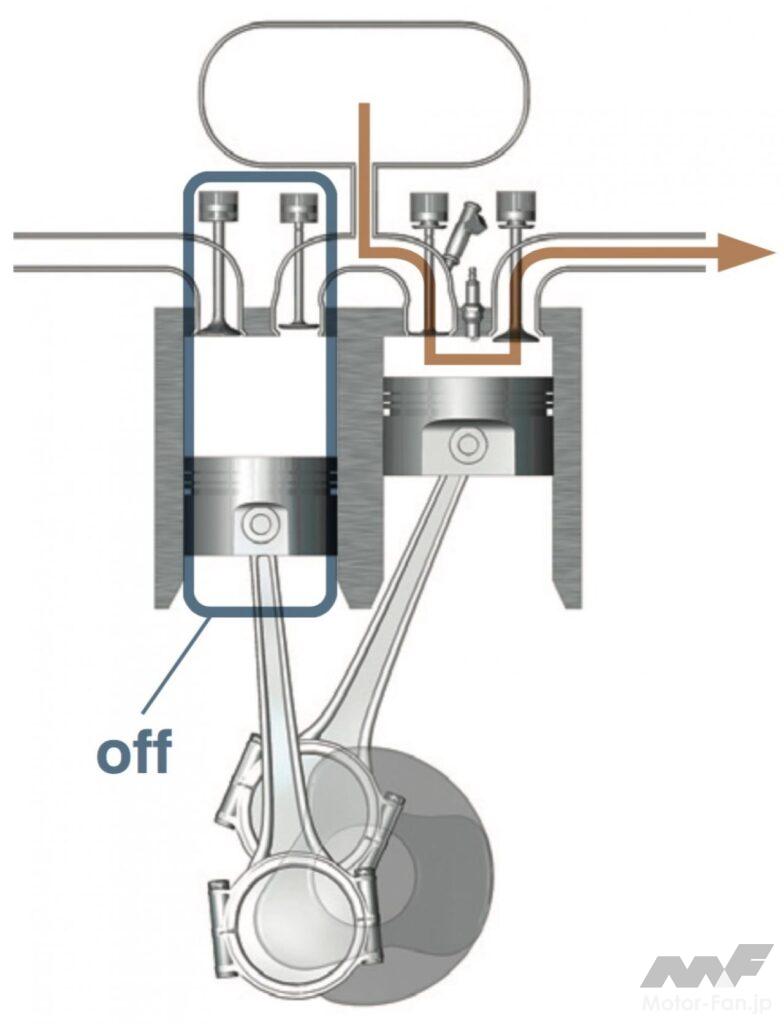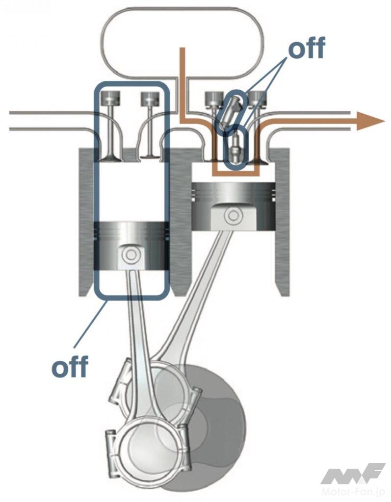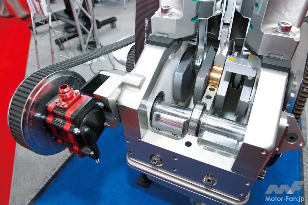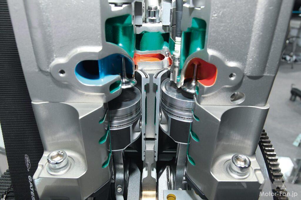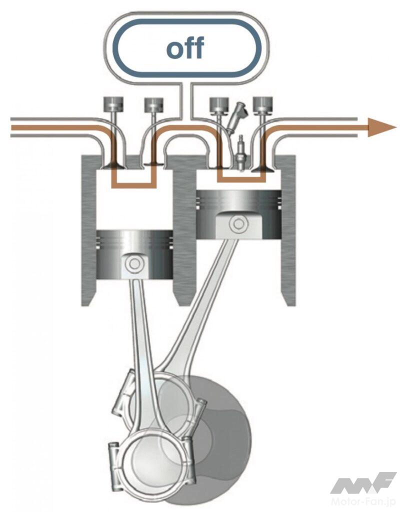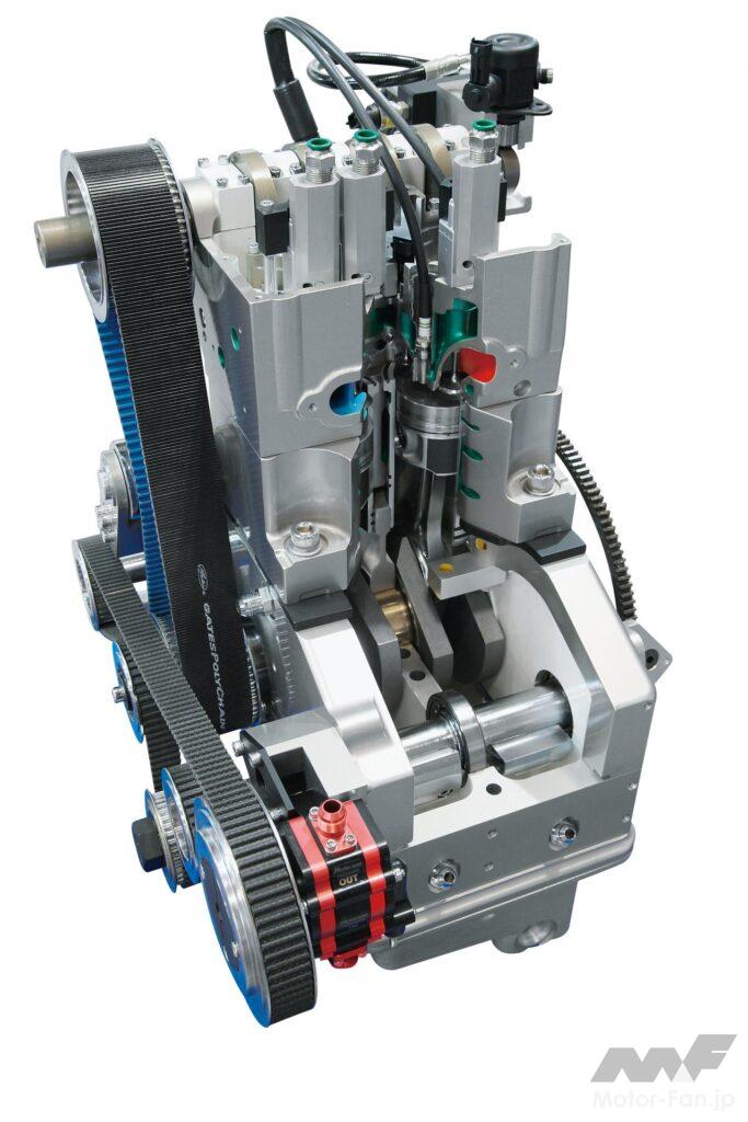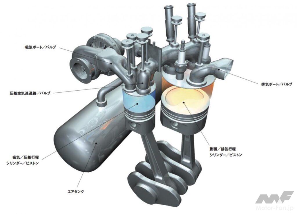 通常であれば混合気を吸入して圧縮させ、というプロセスを経る4ストロークについて、高速流入する圧縮空気を膨張/排気行程のシリンダーに送ることで、より良質の混合気を得、火炎伝播速度も向上させた。