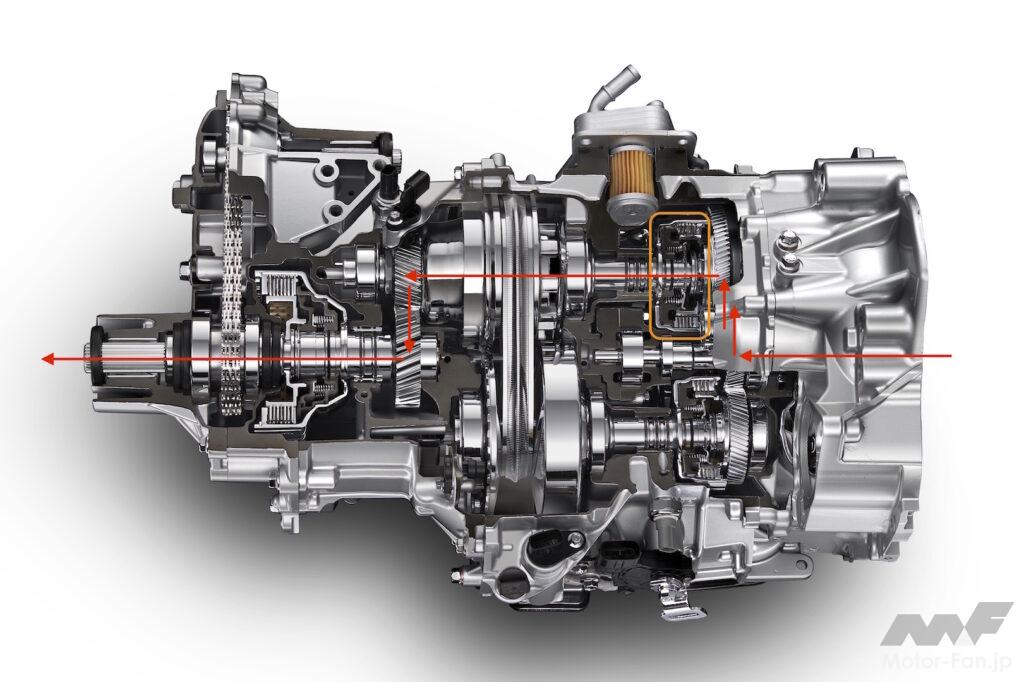 スバル・リニアトロニック。マルチトロニックと同じく、縦置きでチェーン式バリエータユニットながら、基本的に前輪駆動思想からのAWDレイアウト。
