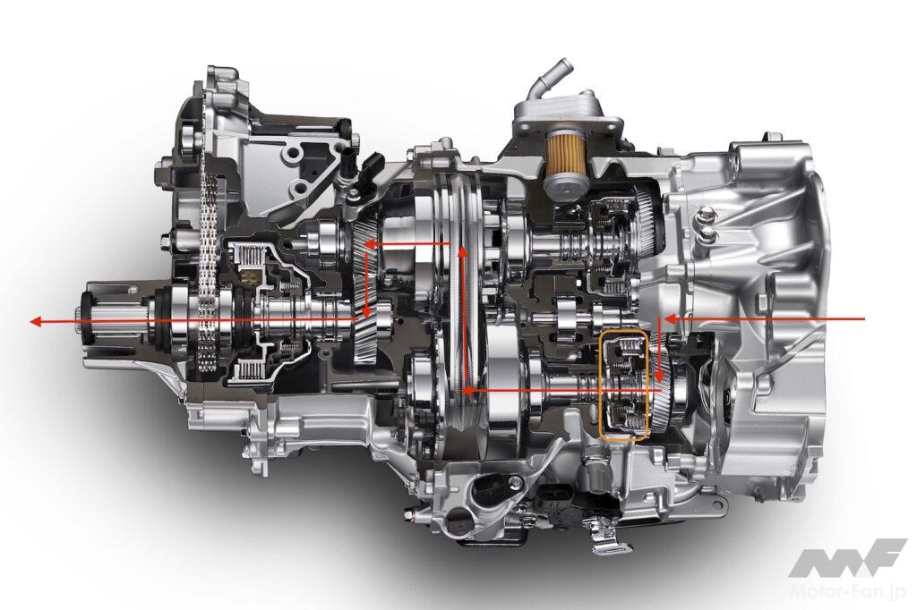 通常のCVTだと前後進切り替えのために遊星歯車機構があり、それのためのクラッチパックが備わるのが常道(ジヤトコの副変速機付CVTはこの遊星歯車機構の増減速によって変速比幅を広げているのはご承知のとおり)。すなわち、逆転のためにクラッチ/ブレーキが少なくともふたつ、その遊星歯車機構の周りにあるはずなのだ。しかしこのCVTは、クラッチパックが離れたところにひとつずつ、3カ所にある。どういう仕組みなのだろうか。
