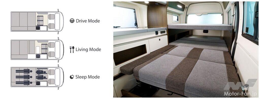 そんなトイファクトリーが製作した「BALEIA」は、ハイエース・シリーズの中でももっとも大きなワイドボディ・スーパーロング・ハイルーフをベース車両として採用。このお陰で大きなラゲッジスペースと高い居住性を両立させているのが特徴で、ドライブモードでも3名の就寝可能な常設スペースがあり、スリープモードでは最大5名の就寝が可能だ。