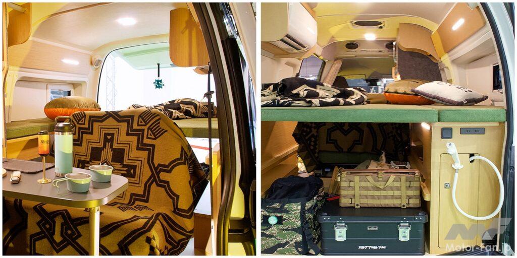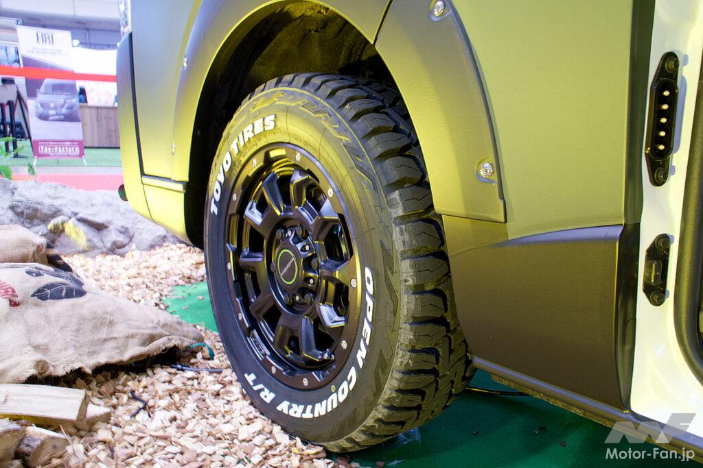 さらに、フェンダーにはブラックのマット塗装を施したアーチカバーを装着し、タイヤは最近のバンコンでは定番となっている「TOYOTIRES OPEN COUNTRY R/T(ホワイトレター)」をチョイス。このキャンピングカーでオートキャンプ場へ乗り込むと、誰もが振り向くような素晴らしいセンスに仕上がっている。