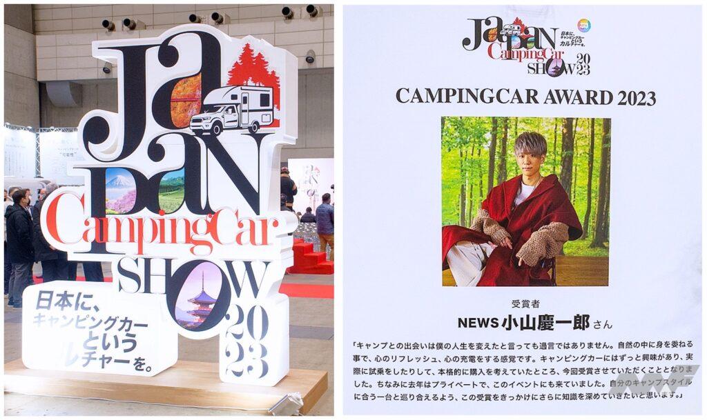 会場には、全国から最新かつ人気のキャンピングカーが300台以上集結したが、開催に先立って本イベントの目玉となる「キャンピングカーアワード2023」の授賞式が行われ、今回はNEWSの小山慶一郎さんが受賞。「キャンピングカーアワード」は、キャンピングカーで楽しむクルマ旅の啓蒙と普及を⽬的とした賞で、2021年は⼭崎育三郎さん、2022年は速⽔もこみちさんが受賞しており、以前からキャンピングカーやアウトドアを愛する著名⼈が表彰されている。
