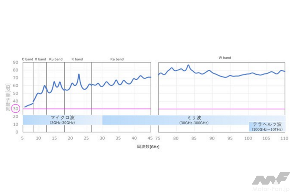5GHzから110GHzと広範な周波数帯域において、電磁波遮蔽性能が30 dB*を越える高い遮蔽性を有している。また、高周波帯域でより高い遮蔽性能を発揮する。