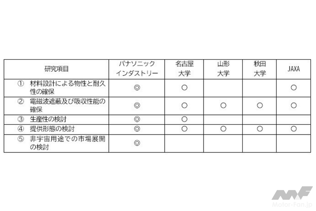 パナソニック インダストリー、名古屋大学、山形大学、秋田大学は、2020年に開始したJAXA宇宙探査イノベーションハブ「アイデア型」※2研究テーマで培ったカーボンナノチューブの研究内容をさらに発展させるべく、2022年6月より「超軽量電磁波遮蔽材料」技術の共同研究が開始された。