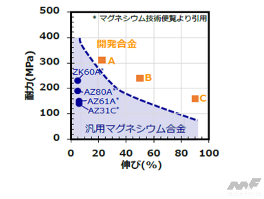 開発品A~Cは合金組成が異なり、A合金は強度重視、C合金は延性重視、B合金はそれらの中間の位置付けで顧客のニーズに応じた合金が提供される。