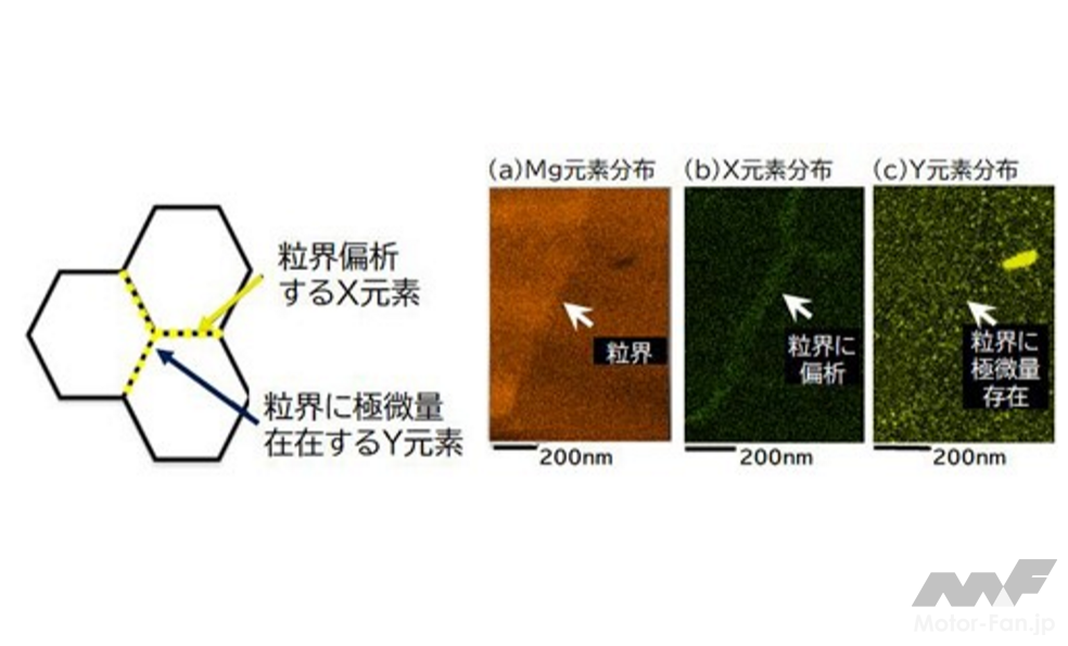 粒界強化に結び付く元素Xを微量粒界に偏析させるとともに、粒界すべりを促進させる元素Yを粒内と粒界にごくわずかに存在させることで、高強度と高延性を両立。