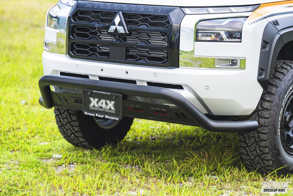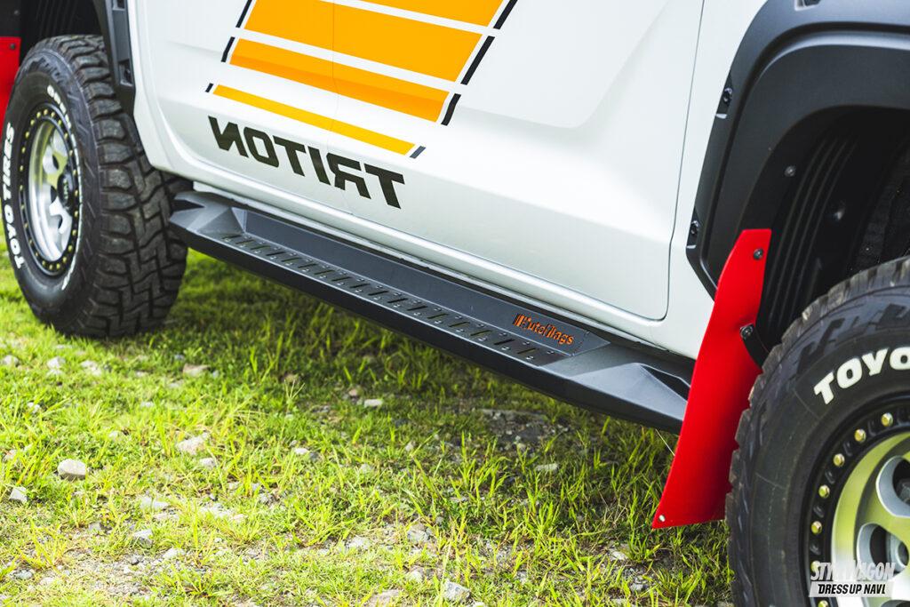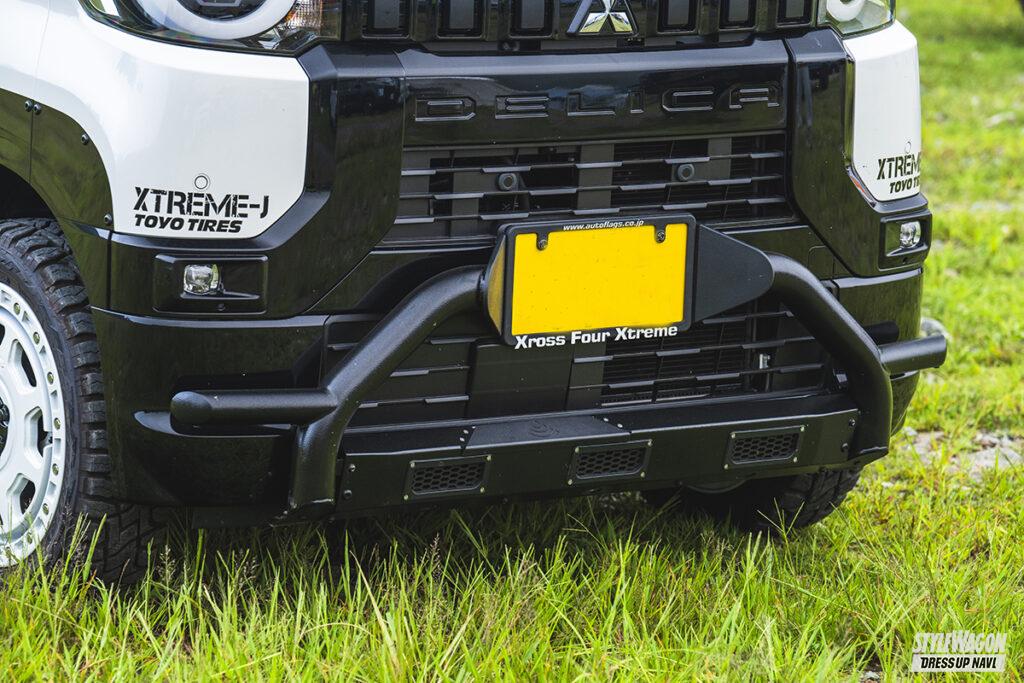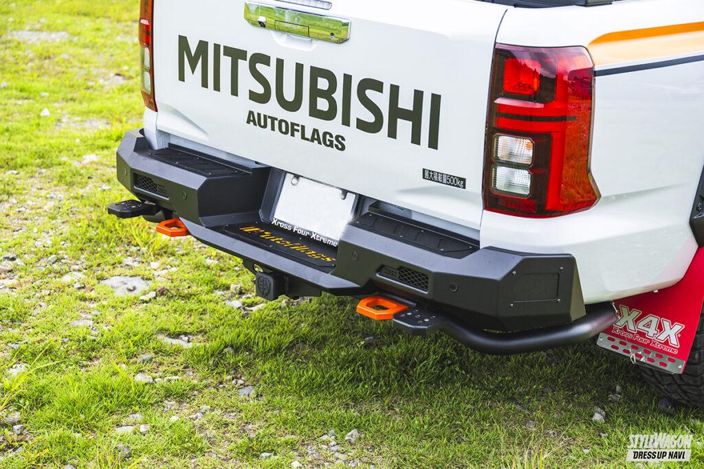 「デリカにこだわる」でおなじみのオートフラッグスは、デリカD:5や話題の軽SUVデリカミニ用カスタマイズパーツを積極的にリリース。そして今年発表され、三菱×4WDの屋台骨を支える新たな刺客、トライトンのパーツも一挙に開発を進めている。カスタムを楽しみたい納車待ちのユーザーに向け、バックアップ体制を整えているところだ。エクステリアに関してはワイルドなスタイリングを持つトライトンに相応しいパーツが目白押し。フロントまわりはデリカD:5でも好評のバンパーガード「GOQUBUTO(ゴクブト)」をまとい、押し出し感を底上げ。ファッション性も備えたロゴ入りのサイドステップ、力強さに満ちあふれたスチール製のリアバンパーも採用して、力強さが倍増。実用性が高い積載アイテムもデザインにこだわり、カッコ良く乗りたいオーナーにアピール!