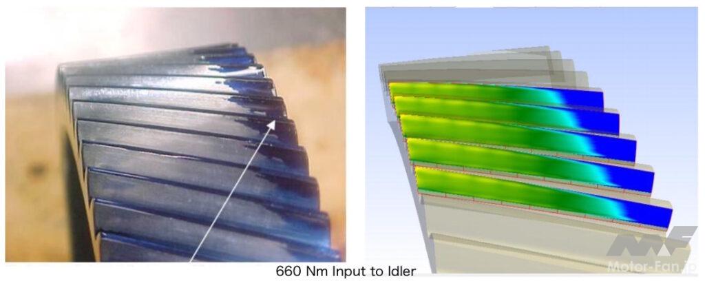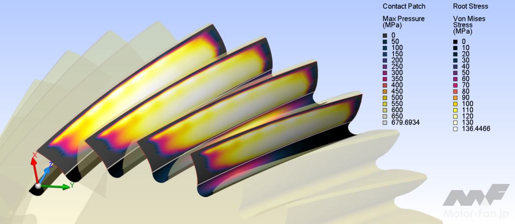 これにより可能になるのが、歯面接触解析(LTCA:Loaded tooth contact analysis)。クラウニングなどといった微細な寸法調整を考慮しながら負荷が掛かる時の歯当たりの状態を解析することができるというもの。これまでは実物のギヤによる実機試験で確認するしかなかったことが、机上でも解析できるということである。