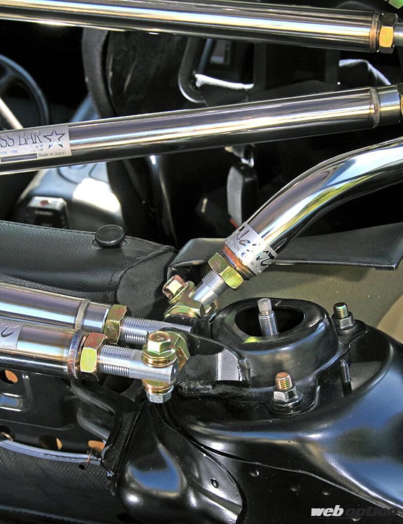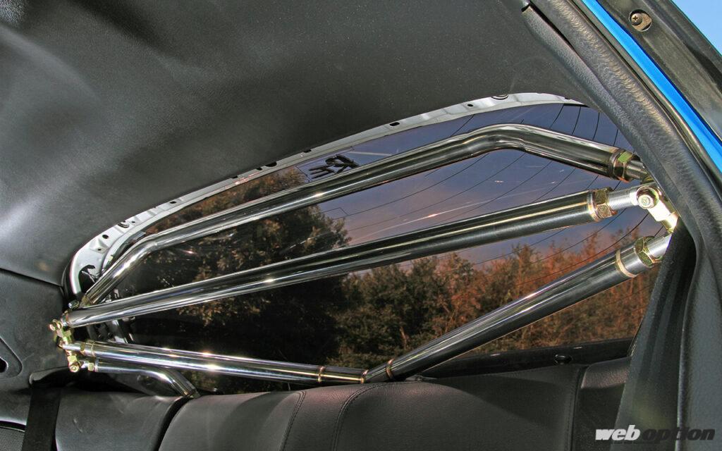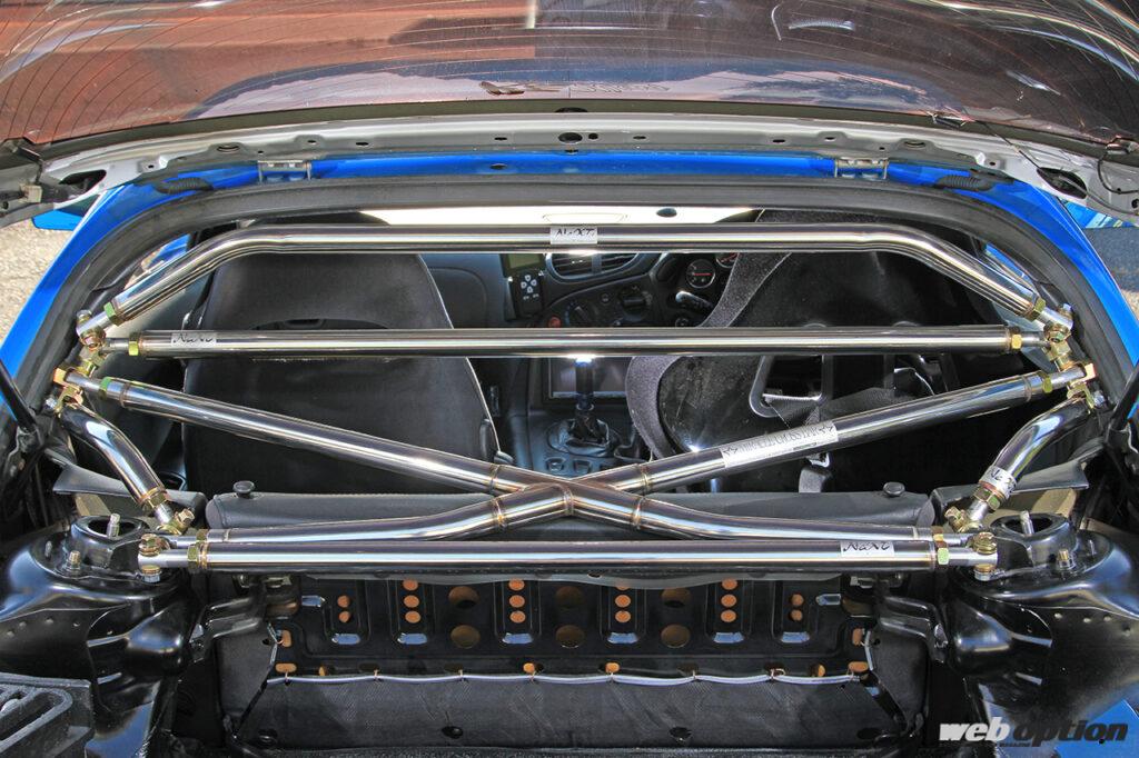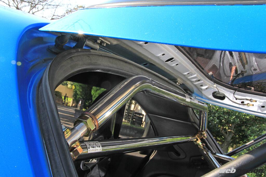 取材車両は、クロスバー(5万9800円)を基本にバタフライバー(3万6000円)や上下パラレルバー(1万9000円)、ルーフバー(2万2000円)といったアップグレードキットを装着。広い開口部をガッチリと補強するため、ボディ剛性は大幅にアップしながらストラットを支点にするためサスペンションの動きも適正化してくれる。現代のハイグリップタイヤの性能を使い切るボディ剛性が実現できるというわけだ。