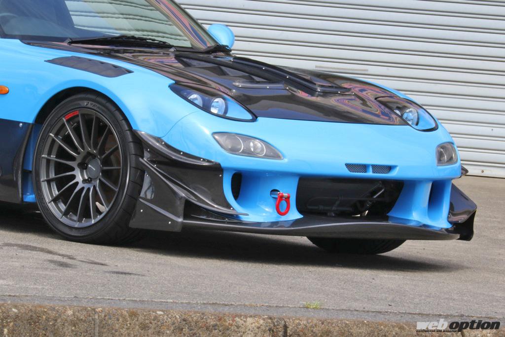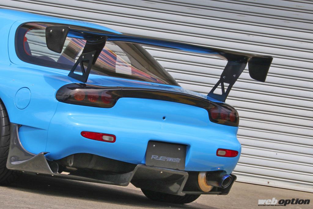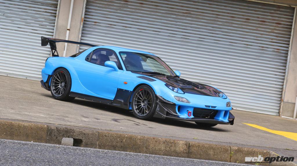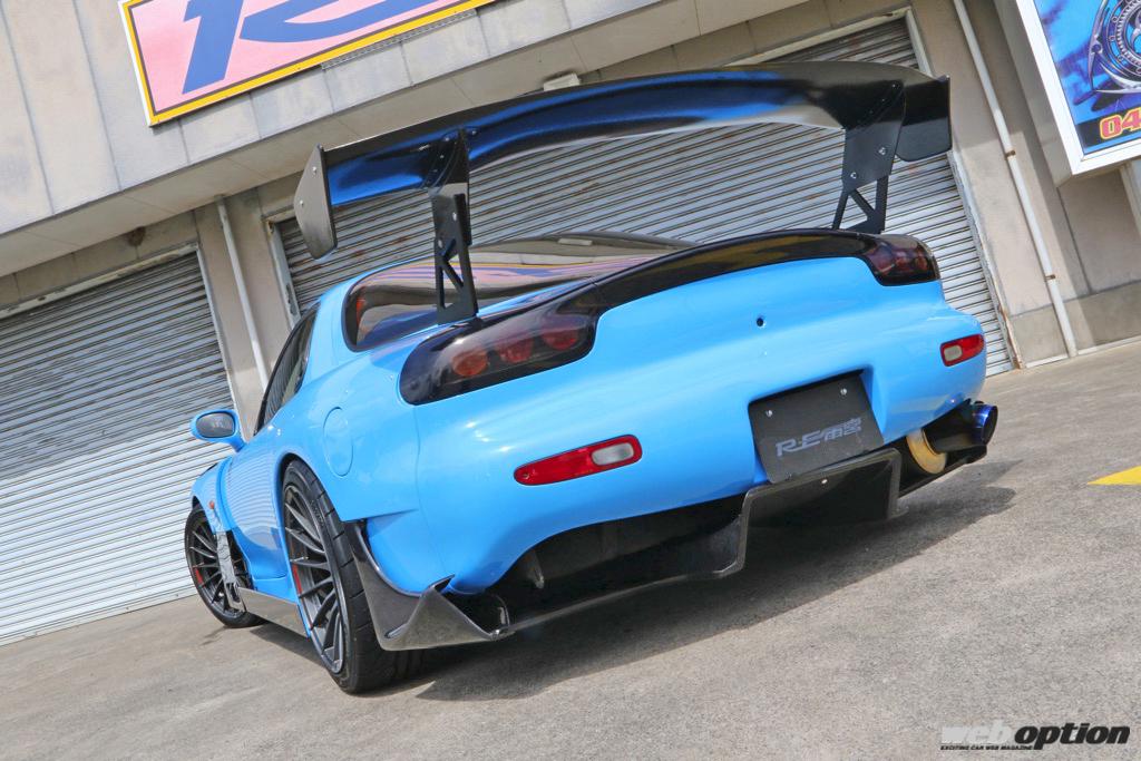 エクステリアは、RE雨宮が『ロータリー魂2019』でお披露目した車重978kgのタイムアタック仕様『RE雨宮 風林火山LM-7』と同一。GT-ADキット1でワイドボディ化し、ソリッドのライトブルー、通称“雨宮ブルー”でオールペンしている。