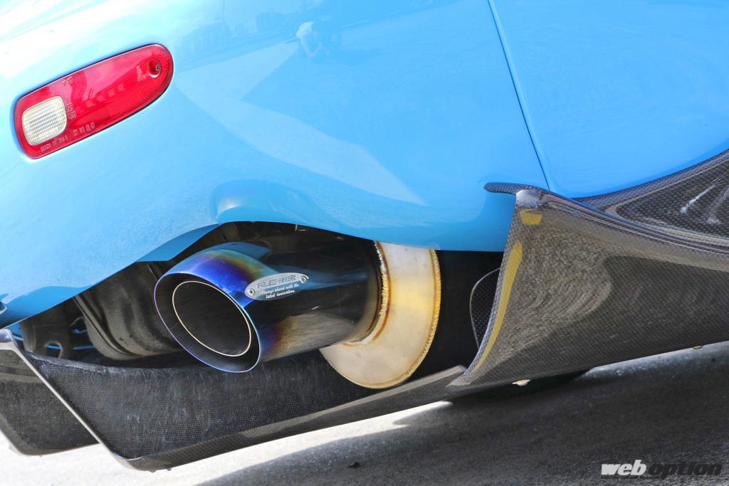 エキゾーストには、ドルフィンテールマフラーのフルチタンモデルを装備。カーボン製のディーフューザーと虹色に輝くテールエンドのコントラストがチューンド指数を引き上げる。