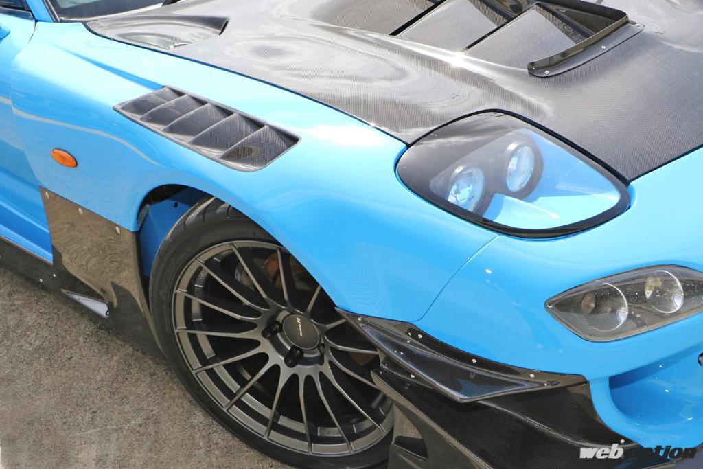 フロントフェンダーは東京オートサロン2019で発表された片側50mmワイドのニューバージョンをインストール。フェンダー上部に設けられたアウトレットダクトがインパクト抜群だ。リヤにはドライカーボン製のGTウイングタイプ2を組み、前後のダウンフォース量を最適化する。