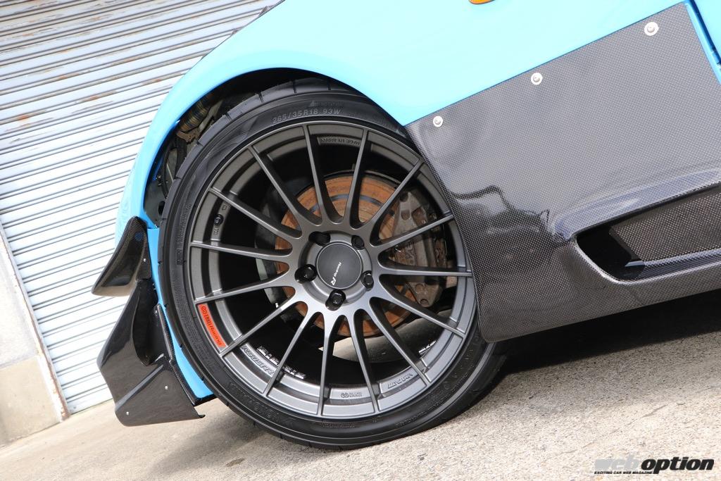サスペンションは先方の意向もあり、テイン製の車高調を軸に構築。ホイールはエンケイのRS05-RR(F10J+18 R11J+16)で、タイヤはアドバンネオバAD08R(F255/35-18 R285/30-18)を履く。